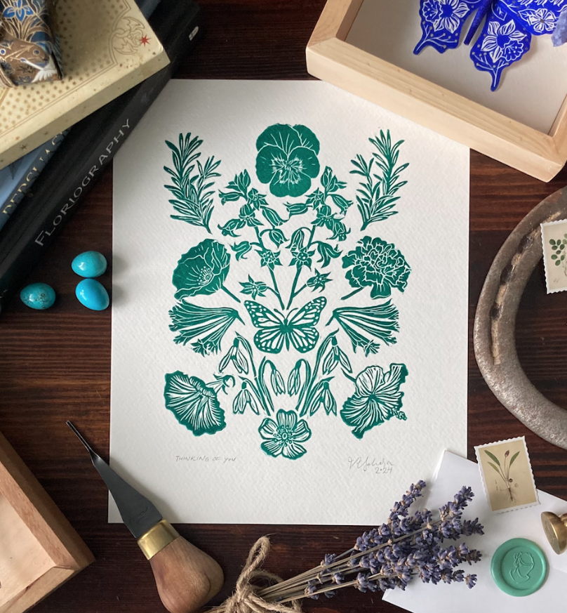 I could spend hours watching her hand carve her linocuts and roll her rich blues and teal greens onto them before revealing the final print.