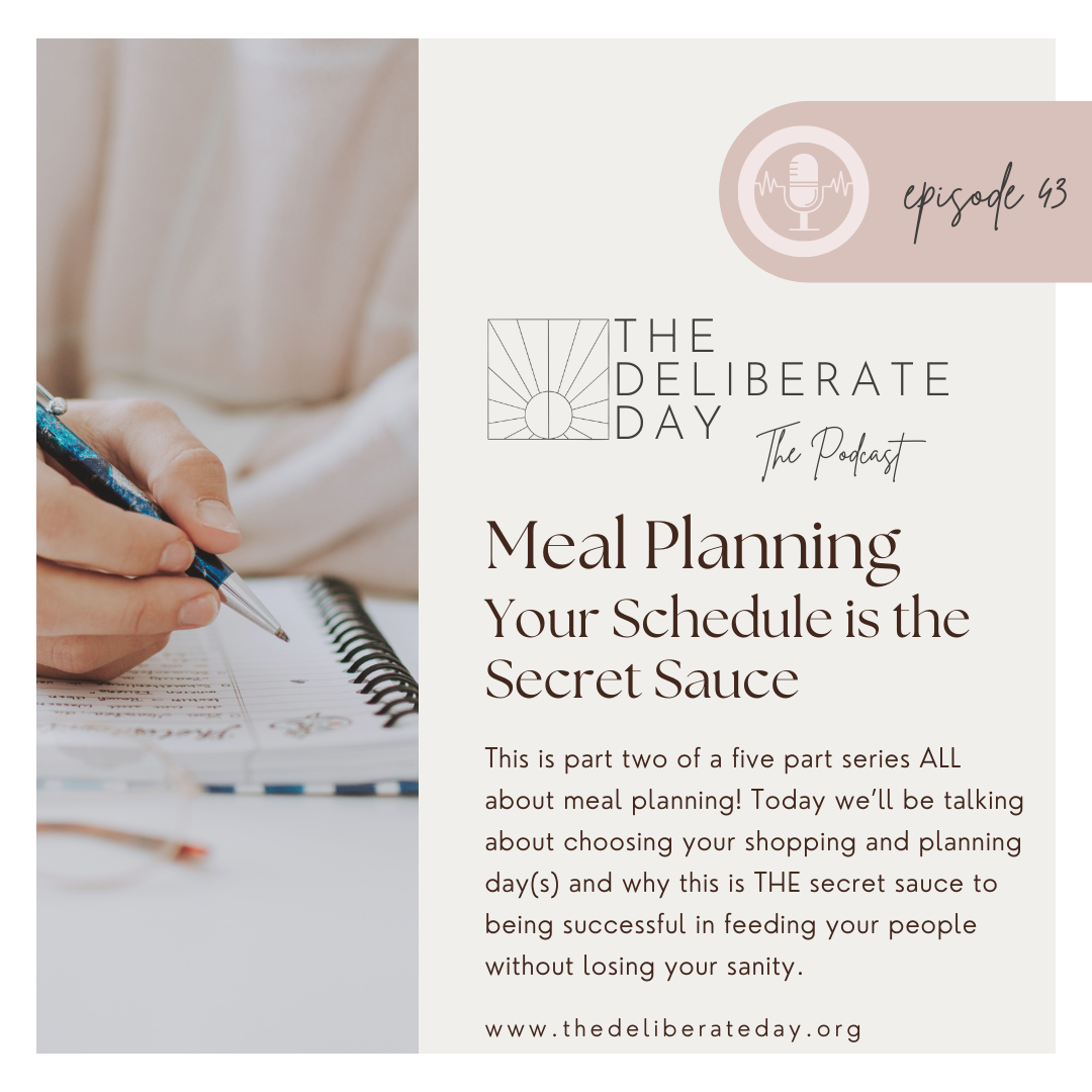 This is part two of a five part series ALL about meal planning! Today we’ll be talking about choosing your shopping and planning day(s) and why this is THE secret sauce to being successful in feeding your people without losing your sanity. If you’re following us on Instagram @thedeliberateday, send us a DM with the word “bonus” and we’ll send you a link to our free mini meal planning kit which has a beautiful meal planning template in it that encourages you to put your schedule right on there, AND it’s an 8-day planner so you can work in that planning and shopping day!